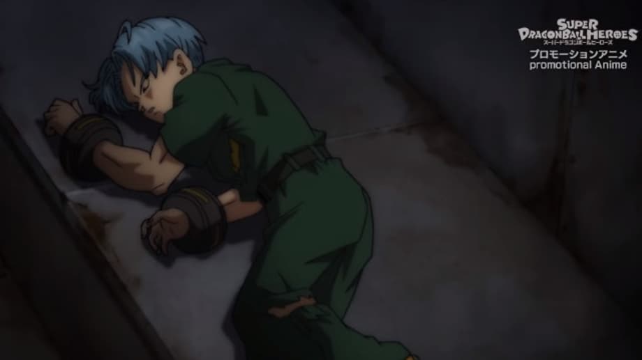 The PR anime finally jumps to Trunks, who appears to be lying in a prison cell and wearing a green prison jumpsuit. His cell door opens and he makes a break for it.