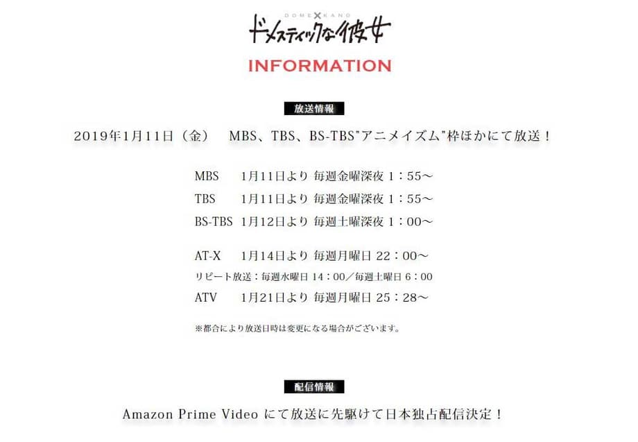 The official domekano-anime website has shared the official release date of upcoming romance anime series Domestic Girlfriend. The site reports MBS is the first Television network broadcasting the show on January 11, 2019, airing on the Anime-ism timeslot. The site has an image showing the timeslots and other networks broadcasting the series.