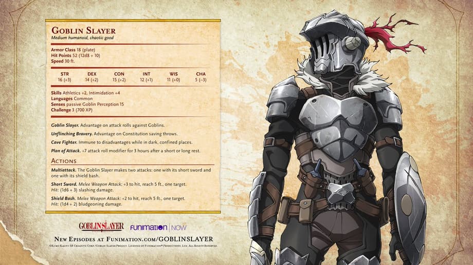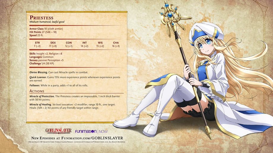 The official Funimation Twitter account has shared two character sheets for Goblin Slayer himself and Priestess. These two images have statistics like Strength, Dextery, Intelligence, Wisdom, Charisma and Constitution. Every character has a unique set of skills, for instance, Goblin Slayer has an advantage on attack rolls against Goblins, obviously.