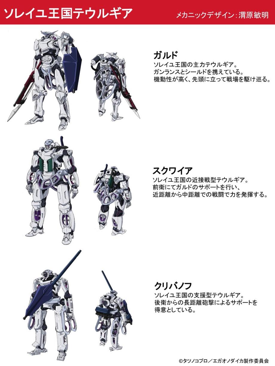 The official egaonodaika website has shared a new key visual and mech designs for the upcoming original anime series Egao no Daika or The Cost of Smiles. The key visual has several main characters pose, adjusting glasses, waving, opening arms to someone and two characters are ready to jump to action. Their mechas can be seen standing tall in the background. Five mech designs were shared, three white-based and two green-based.