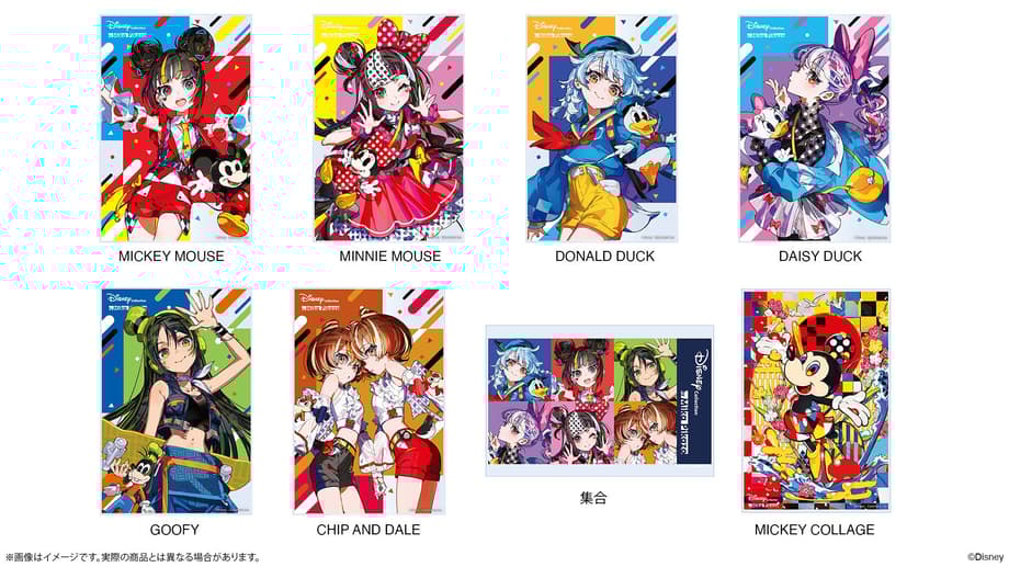 The Disney Illustration Collection features cutesy anime girls wearing clothing heavily inspired by seven classic Disney characters: Mickey Mouse, Minnie Mouse, Donald Duck, Daisy Duck, Goofy, and Chip and Dale. Each character is holding a plushie of the character who has inspired their clothing.