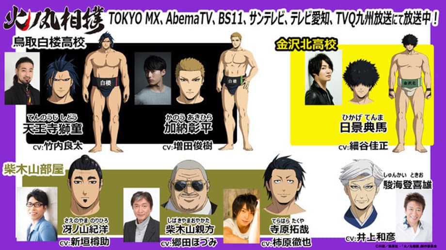 The new voice actors are: Ryota Takeuchi as Shido Tennoji, Toshiki Masuda as Akihira kano, Yoshimasa Hosoya as Tenma Hikage, Kazuhiko Inoue as Shunkai, Tarusuke Shingaki as Norihiro Saenoyama, Hozumi Goda as Oyakata Shibakiyama and Tetsuya kakihara as Takuya Terahara.