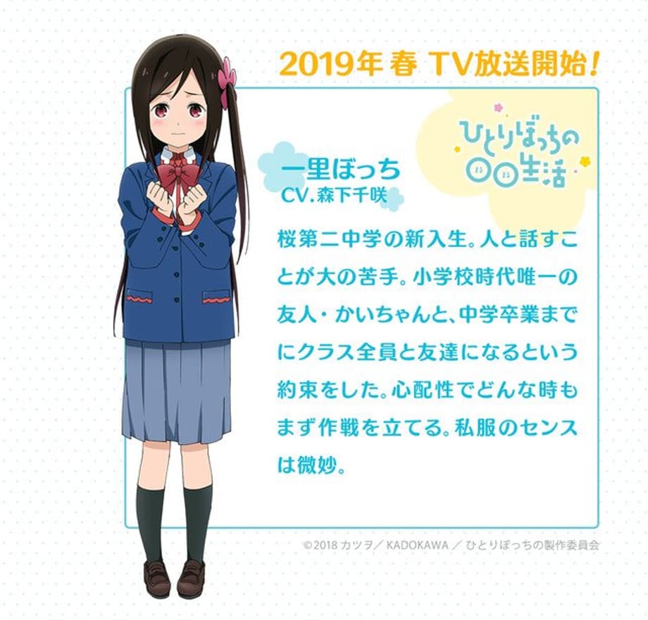Hitori Bocchi suffers from extreme social anxiety, she's not good at talking to people, takes pretty extreme actions, is surprisingly adept at avoiding people, her legs cramp when she overexerts herself, gets full of herself when alone, will vomit when exposed to extreme tension and often comes up with plans. Now she is entering middle school and her only friend, Yawara Kai, is attending a different school. This leaves Bocchi alone, surrounded by new classmates with whom she must make friends before Kai will talk to her again.