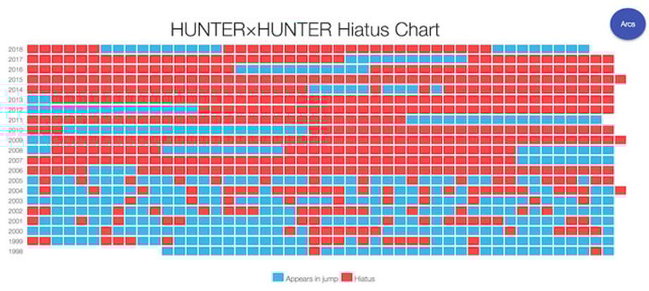 Author Togashi states that ten weeks of storyboards have been finalized and will continue to work on the manga series as he focuses on health and getting better. The manga's cover for volume 36 is down below as well as a hiatus chart that explains how many breaks the series has taken.