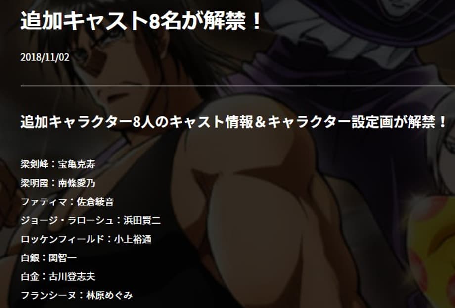 The official Karakuri Circus website has revealed new voice cast members joining the project. The new actors are: Katsuhisa Houki as Ling Jianfong, Yoshino Najo as Ling Mingxia, Ayane Sakura as Fatima, Kenji Hamada as George LaRoche, Hiromichi Kogami as Rockenfield, Tomokazu Seki as Baiying, Toshio Furukawa as Baijin and Megumi Hayashibara as Francine.