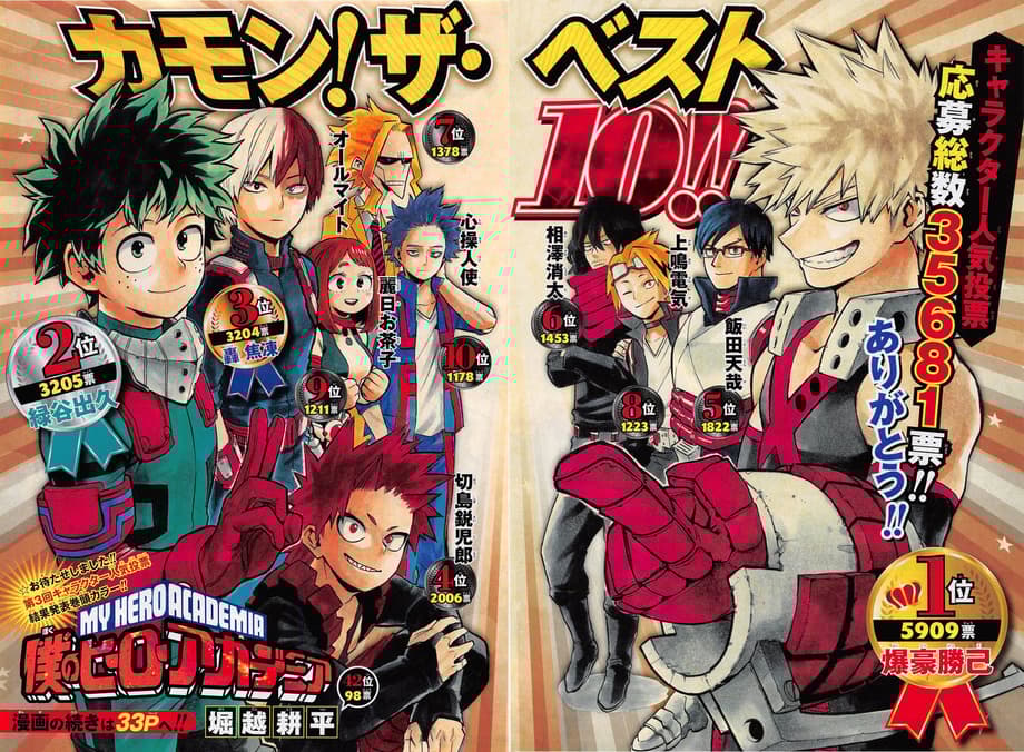 If your a longtime fan of manga or anime, popularity polls in Weekly Shonen Jump are something you're very familiar with. Sasuke regularl dominated the popularity polls for Naruto while Tōshirō Hitsugaya regularly upstagged Ichigo as the most popular character in Bleach. Well, the latest character popularity poll for My Hero Academia also has some surprising results as Katsuki Bakugo upstaged Deku to take the top slot. Check out the rankings below.