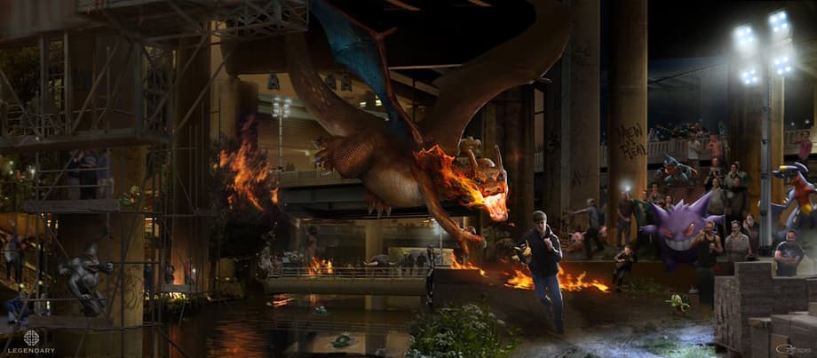 These pieces of concept art appear to be of an early version of the Pokemon fight club which featured in the film. The first piece that Palmer shared features Tim Goodman and, his Pokemon companion, Detective Pikachu amid a tense chase involving Charizard. Countless other Pokemon creatures also appear in this concept art.