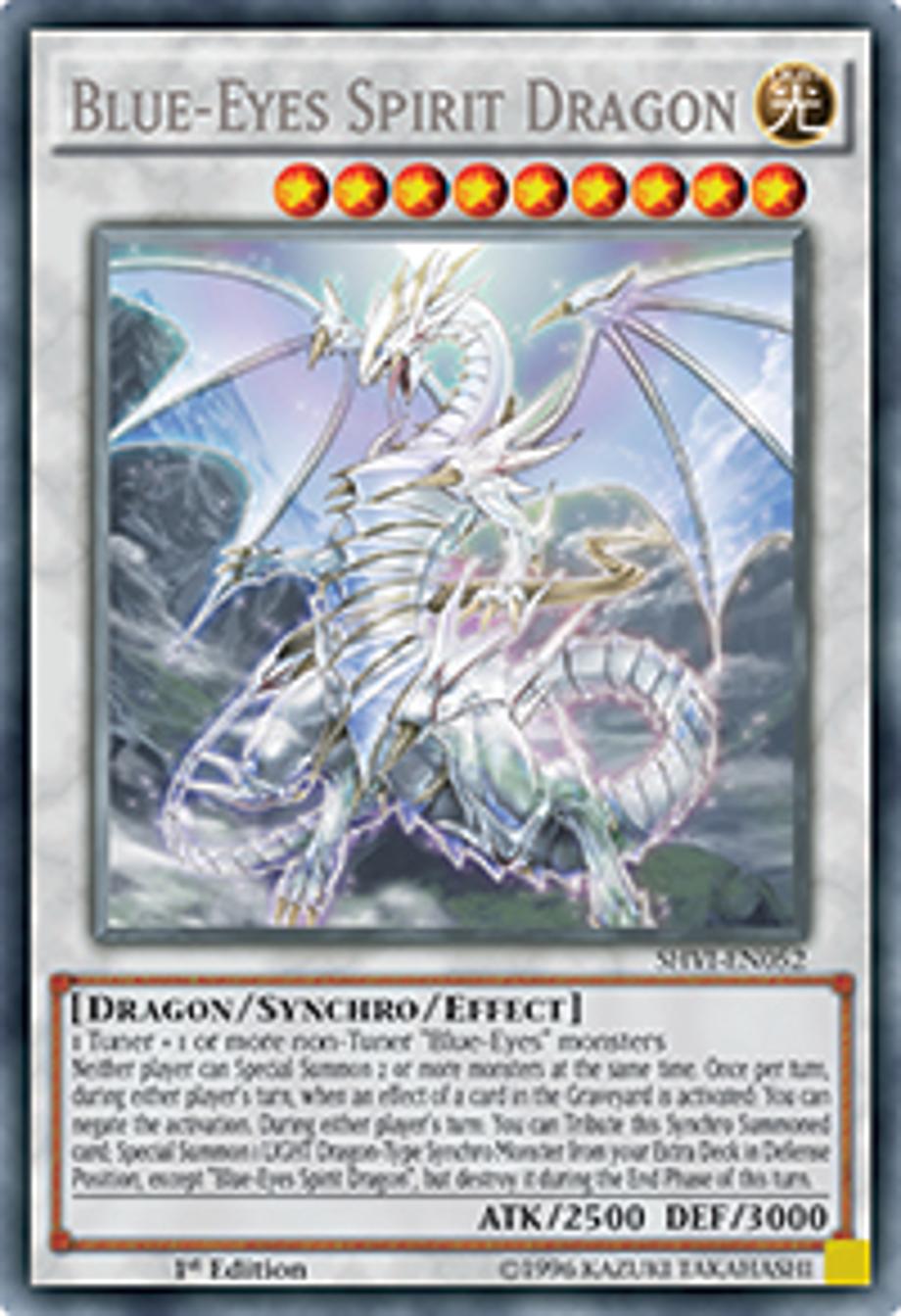 Blue-Eyes Spirit Dragon is a Level 9 Synchro Monster that you Synchro Summon using a Tuner and one or more non-Tuner “Blue-Eyes” monsters. It has 2500 ATK, 3000 DEF, and a slate of special abilities that help Blue-Eyes White Dragon take on the toughest opponents around! While you control Blue-Eyes Spirit Dragon, players can’t Special Summon more than one monster at a time, erasing the massive advantage normally enjoyed by Pendulum Summoning Decks. You can also negate the effect of a card that activates in the Graveyard once during each player’s turn, making Blue-Eyes Spirit Dragon a great weapon against Burning Abyss, Phantom Knight and Kozmo Decks as well. And if neither of those abilities help you in your current Match, you can Tribute your Synchro Summoned Blue-Eyes Spirit Dragon during either player’s turn to Special Summon a different LIGHT Dragon-Type Synchro Monster from your Extra Deck that can help you!