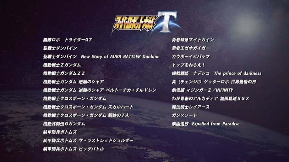 There is no information on an English version of the game or a western release date. This game is a crossover that features mecha animes from Japan. The new series that will be included in the game are: Cowboy Bebop, Expelled from Paradise, Arcadia of My Youth: Endless Orbit SSX and Magic Knight Rayearth. Here is the full list and previously-confirmed series appearing in the game: